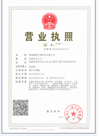 证书介绍 证明 福建融然生物科技有限公司拥有 生物技术研发,技术咨询,技术服务,电子产品,一类医疗器械,日用品,办公用品,化妆品,初级农产品,建筑材料,建筑机械,电子设备,保健食品,药品的批发及代销代购。(依法须经批准的项目,经相关部门批准后方可开展经营活动) 的资质